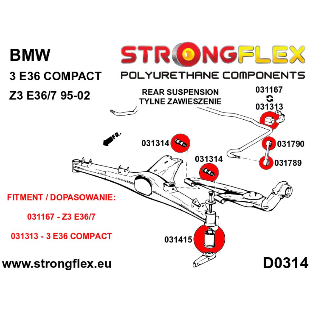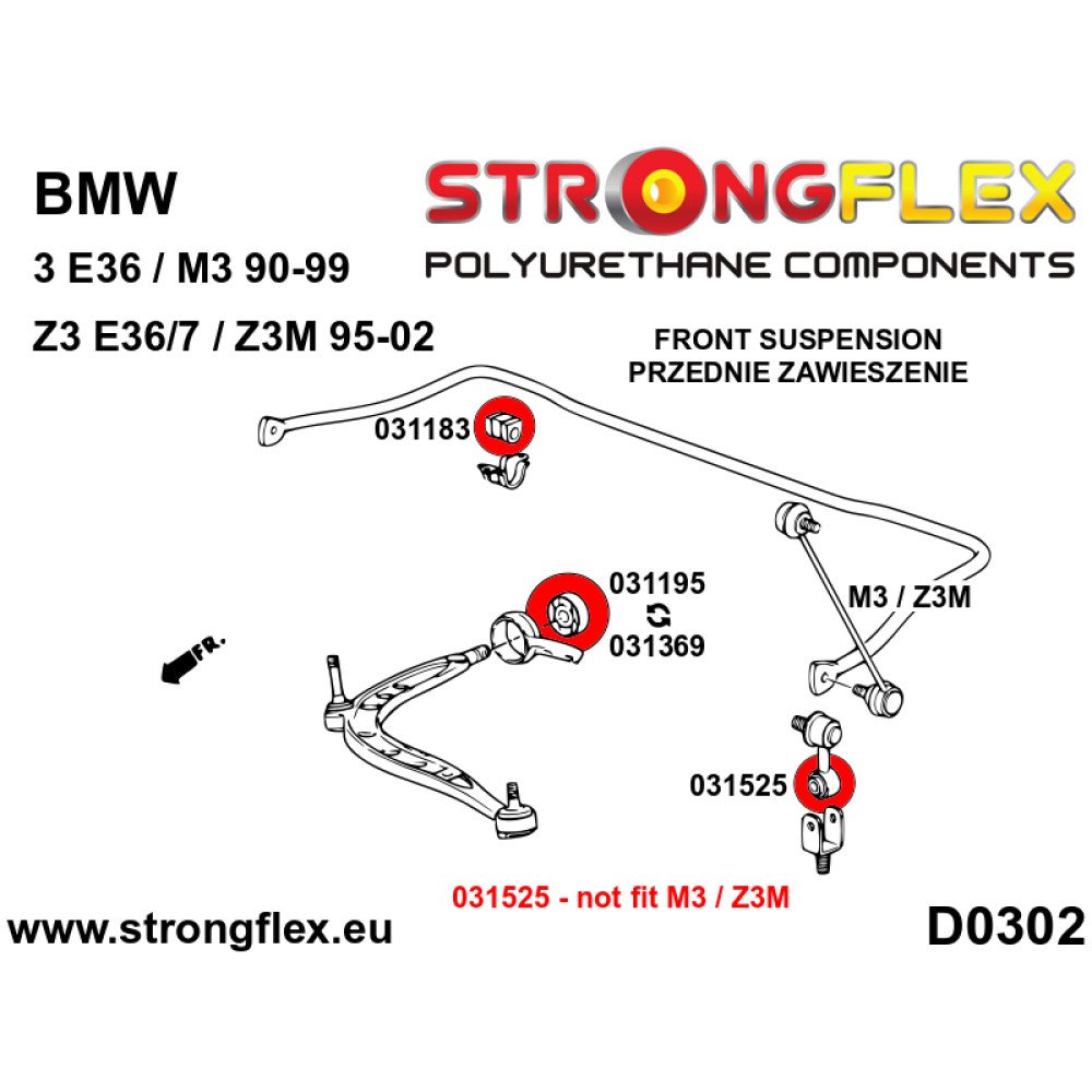 - The 031525 bush is specifically designed for the link attached to the wishbone and is not compatible with the link connecting the stabilizer to the shock absorber. This part does not fit E36 M3 and Z3M models.