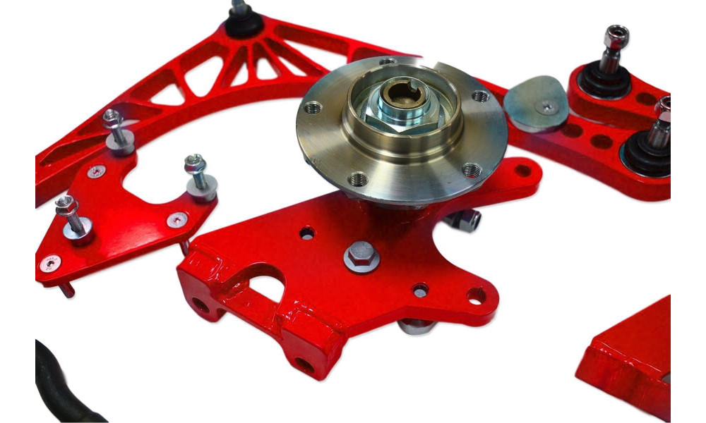 • Reduced bump-steer by restoring the nominal (factory) swingarm position on lowered cars
