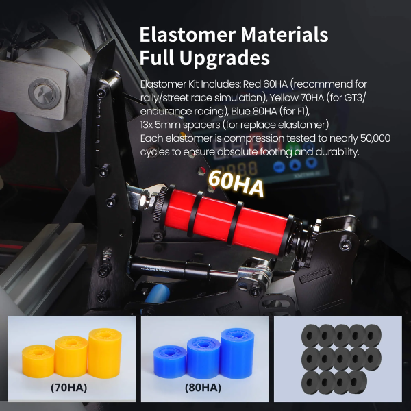 - Three elastomers (varying hardness) and 13 damping spacers for customizable pedal response. Snap-on mechanism for quick elastomer changes.