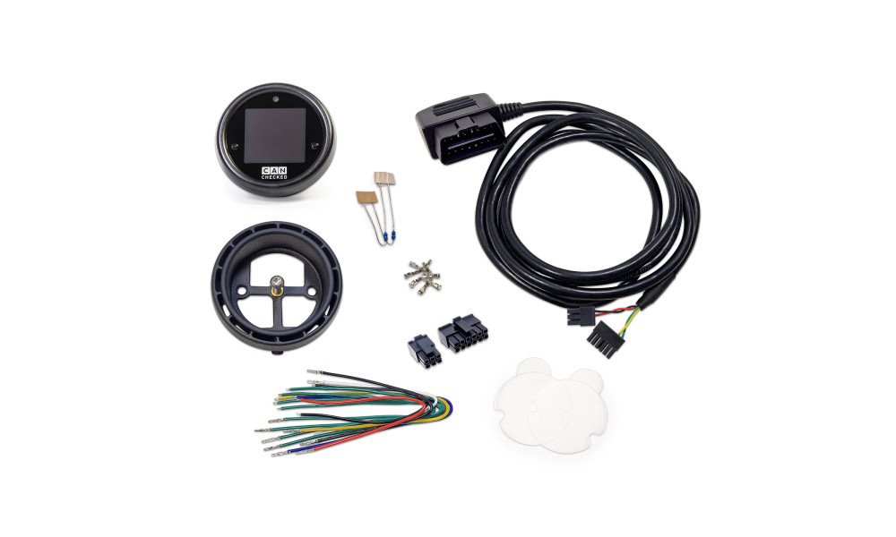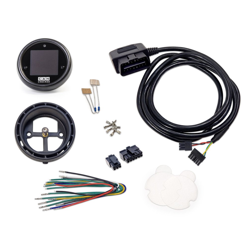 The CANchecked MFD15 Gen2 is a compact OLED gauge-style display designed to keep key vehicle data in view. The OLED screen is readable even in direct sunlight, and the 52 mm outer diameter fits common interior bezels (even without a vehicle-specific holder). Operation is via two windshield-mounted push buttons or an optional rotary knob.