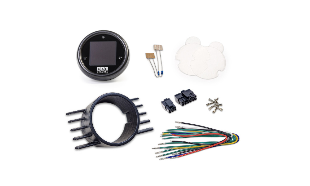 The CANchecked MFD15 Gen2 is a compact OLED display designed to keep key ECU and sensor data in your line of sight. The OLED screen remains easy to read even in direct sunlight. With a 52 mm outer diameter and just 12.5 mm depth, it fits common 52 mm interior bezels, including the included vehicle-specific air-vent bezel. Control is via the two windshield-mounted push buttons, or optionally with an external rotary knob.