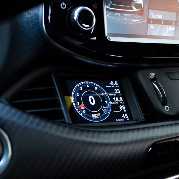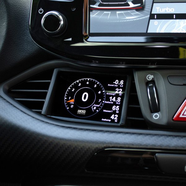 The MFD28 Hyundai i30N vFL Display is an in-cluster data display that reads ECU sensor data directly over the vehicle’s manufacturer-specific CAN bus. It’s designed to integrate cleanly into the interior using a custom-made frame with an OEM-style fit. The CAN protocol has been optimized for high query speed.