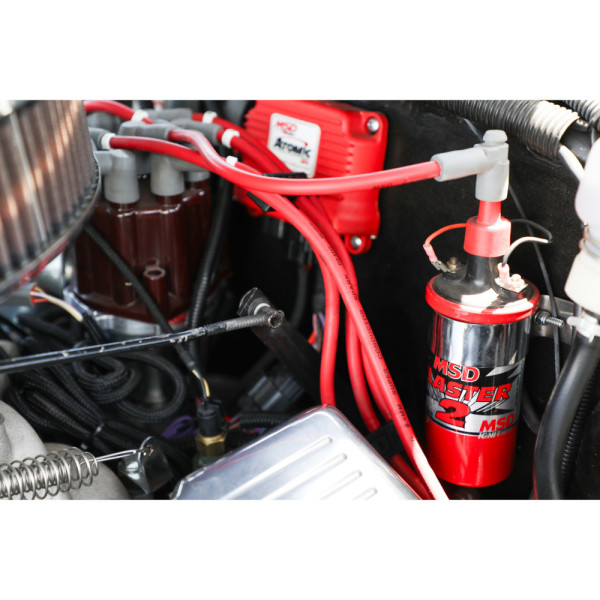 MSD Blaster 2 Ignition Coil - Red SpecificationsThe MSD Blaster 2 ignition coil is ideal for use in conjunction with an MSD 5 6 or 7-series an MSD Blaster Ignition or any other electronic ignition system (requires ballast resistor not supplied). This coil improves spark production for superior performance and increases fuel economy.This coil benefits from an alkyd tower with high dielectric properties that repels the formation of carbon tracking. Cooled in a metal case filled with high-quality oil special windings are capable of delivering an exceptional maximum voltage build-up of 45 000 volts. Compatible with most factory canister coil mounts this coil must be placed in a vertical position for optimum efficiency.