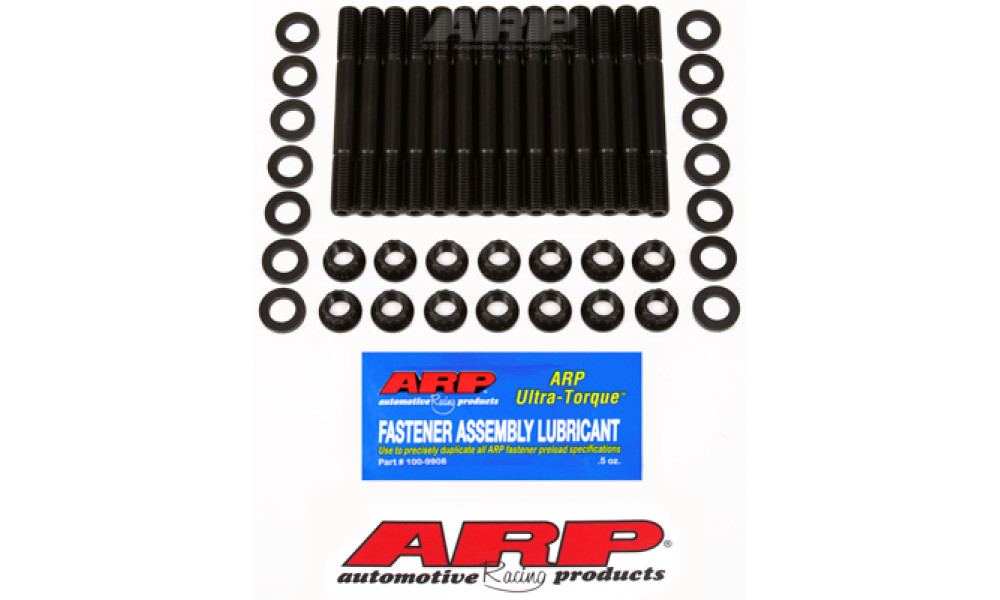 ARP main studs are made from premium-grade 8740 chrome moly steel and heat-treated to 200,000 psi tensile strength. They feature precision J-form rolled threads formed after heat-treat for increased thread strength, and are designed to help reduce crankshaft flex and main cap fretting.