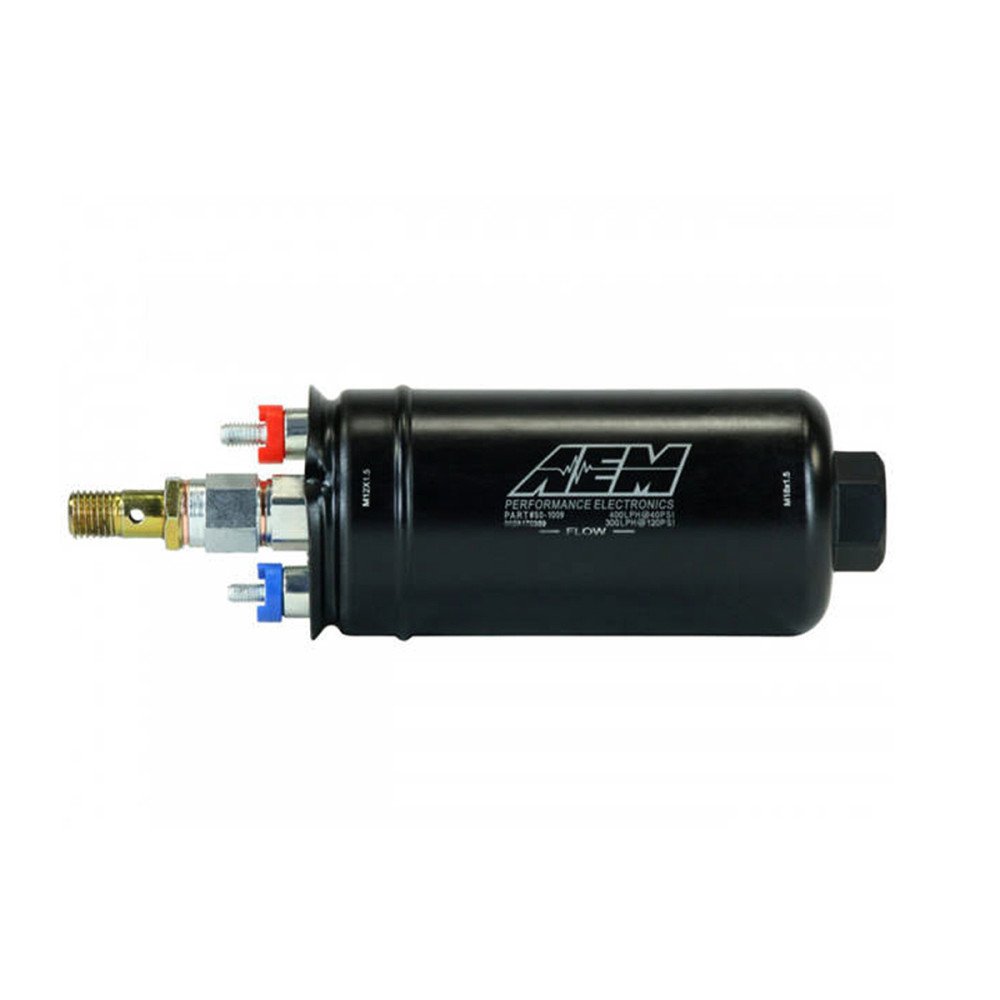High-performance AEM 400lph fuel pump. 400 lph at 2.75 bar, 300 lph at 8.27 bar. M18x1.5 Inlet & M12x1.5 Outlet . The kit includes fuel pump, installation instructions, check valve connector, tips/covers/nut tip wires. The pump is a universal pump.