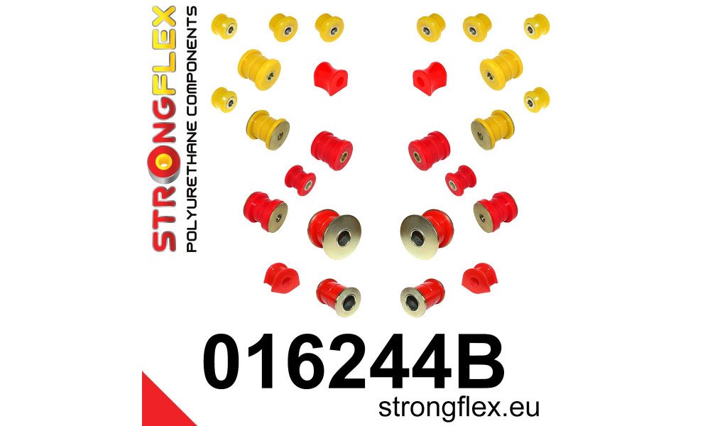 Certain bushes in this kit are exclusively available in 90ShA hardness (yellow) due to the original rubber bush's hard compound. Utilizing the 80ShA hardness bush (red) will revert the driving experience to that of the original rubber bush.