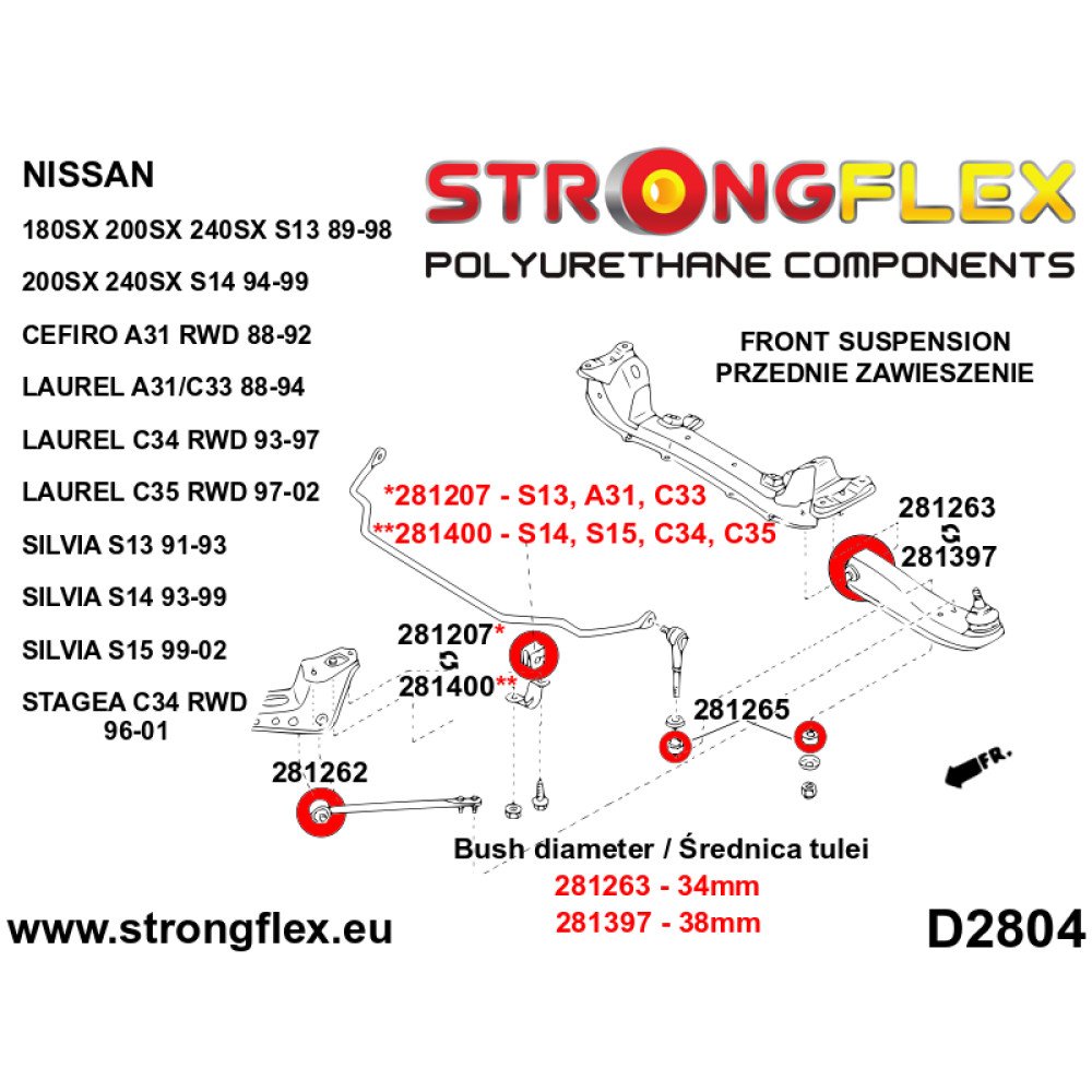 - Ensure to verify the diameter of the front wishbone bushes: Ø34mm (281263) or Ø38mm (281397) before ordering.