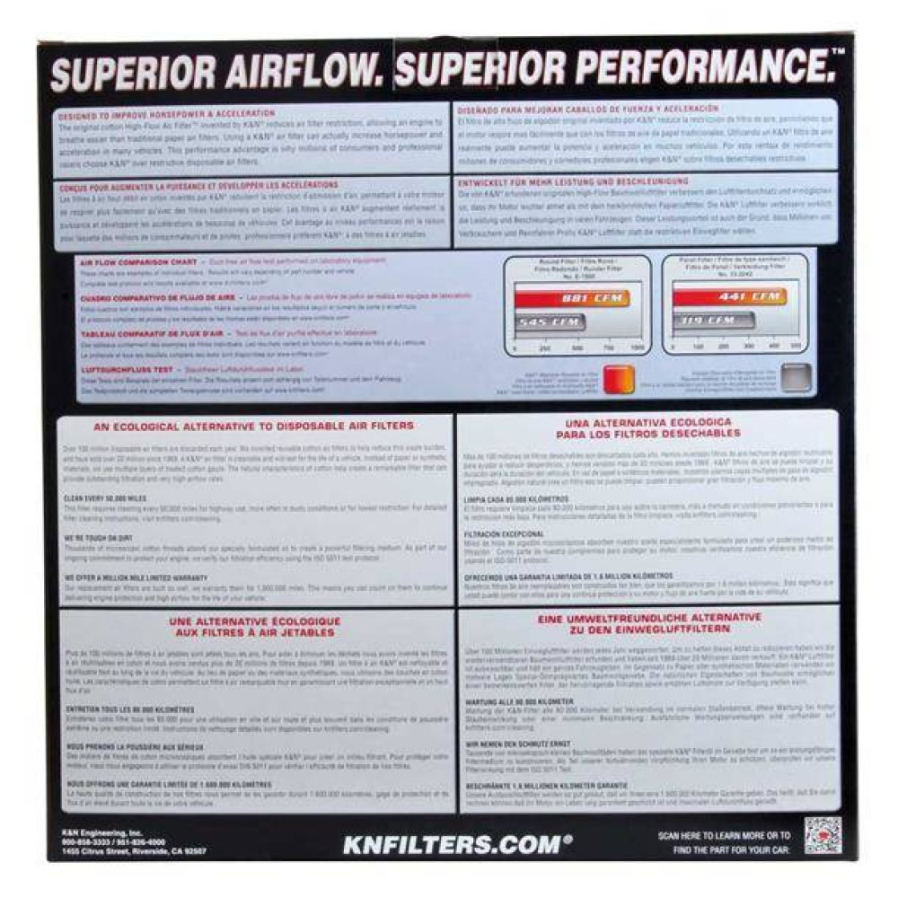 Each performance air filter is reusable, engineered to last for the entire lifespan of your vehicle, and backed by K&N's 10-Year/Million Mile Limited Warranty.