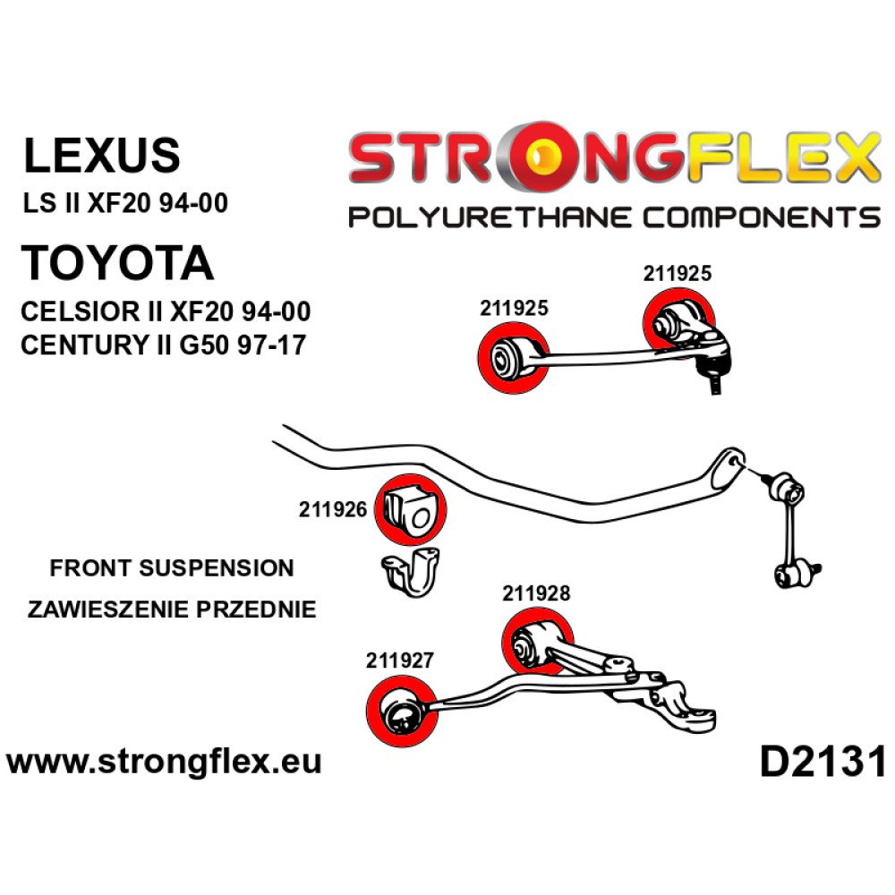Elevate your vehicle's performance with the RaceStage.eu SPORT Front Suspension Bush Kit, meticulously engineered for enthusiasts who demand precision and durability. This comprehensive kit is designed to enhance the handling and responsiveness of your Lexus LS II, Toyota Celsior II, or Toyota Century II, ensuring a superior driving experience on both the road and track.
