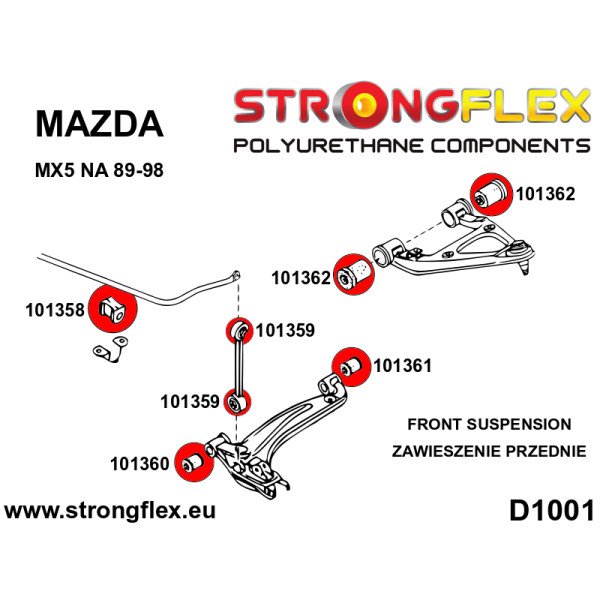 Upgrade your Mazda MX-5 / Miata Roadster I with our Full Suspension Polyurethane Bush Kit - SPORT, meticulously engineered for enhanced handling and performance. This comprehensive kit replaces your factory rubber bushings with high-quality polyurethane components, delivering superior durability and responsiveness on the road. Experience improved cornering stability and reduced body roll, allowing you to push your vehicle to its limits with confidence.