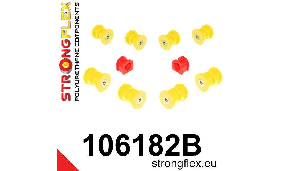 - Certain bushings in this kit are exclusively available in a 90ShA hardness (yellow) due to the original rubber bush's composition, which utilizes a firmer rubber material. Opting for the 80ShA hardness bush (red) will revert the vehicle's handling characteristics to those of the original rubber bush.