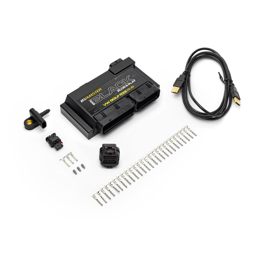 The Ecumaster EMU Black Plug-In ECU for R32 VR6 BUB engines is engineered for direct OEM replacement, utilizing advanced EMU Black technology within a custom CNC aluminum enclosure that matches factory environmental standards. This plug-and-play solution streamlines installation by eliminating the need for separate adapters, reducing complexity and setup time. The unit comes pre-loaded with a stock base map for immediate compatibility. Additional features, such as expanded inputs/outputs and lambda control, can be accessed via the included auxiliary harness. The package includes: