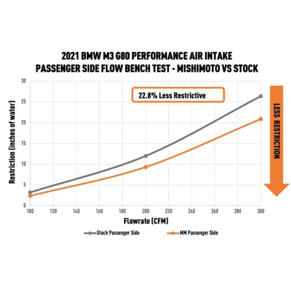 - Reduced air intake restriction by 13% (driver-side) and 22.8% (passenger-side) compared to stock