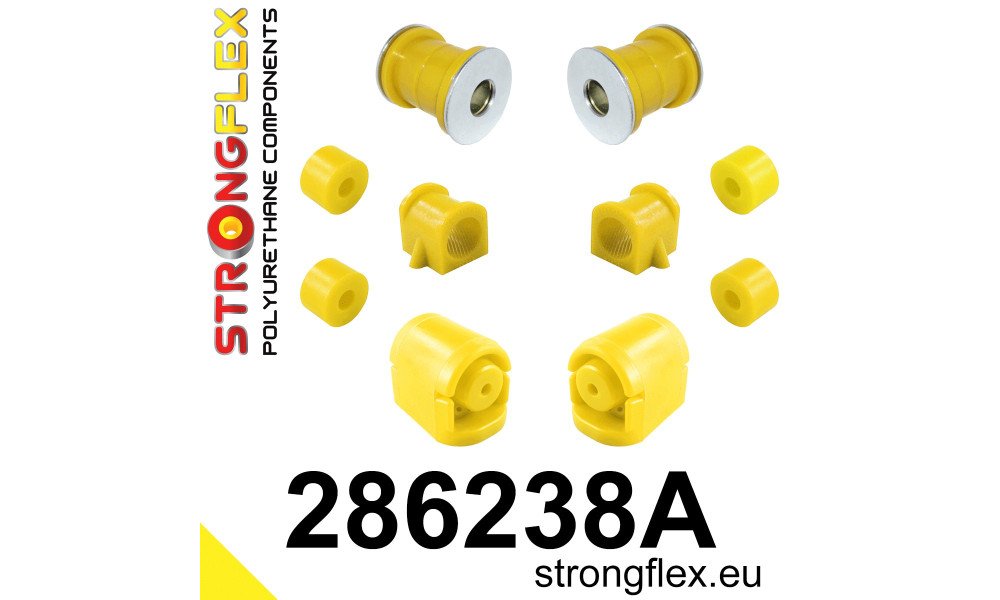 Crafted from high-quality polyurethane, these bushings offer a remarkable hardness rating of 90 Shore A, ensuring durability and resistance to wear under demanding conditions. The kit includes essential components such as front lower arm bushes, wishbone rear bushes, anti-roll bar link bushes, and anti-roll bar bushes, all meticulously designed to reduce flex and improve steering precision.