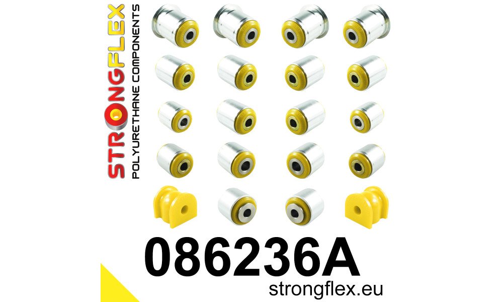 - This kit is exclusively available in a 90ShA hardness (yellow), as the factory-installed rubber bushings utilize a firmer rubber compound. Opting for the 80ShA hardness bushings (red) will revert the vehicle's handling characteristics to those of the original rubber components.