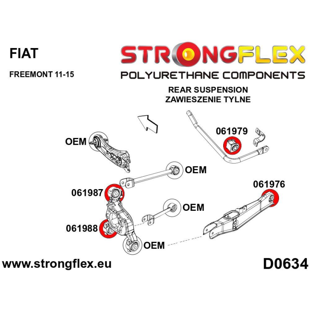 The kit includes two rear arm bushings, two upper and two lower rear hub bushings, and two rear anti-roll bar bushings, all tailored to fit seamlessly into your Fiat Freemont (2011-2015). With a hardness rating of 80 Shore A, these bushings provide the perfect balance between comfort and performance, reducing unwanted flex while maintaining a smooth ride.