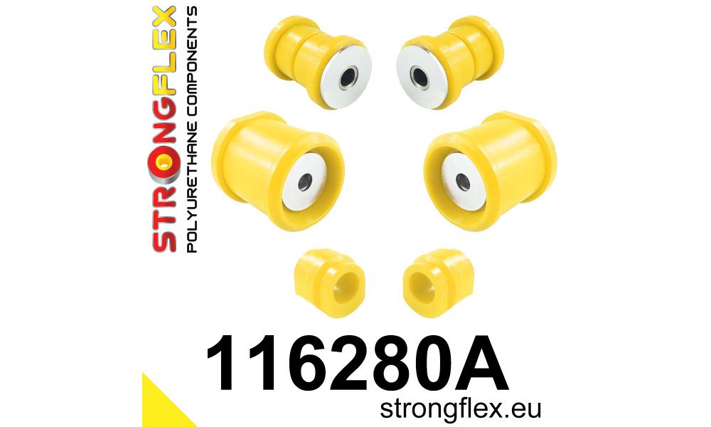 - This kit is exclusively available in 90ShA hardness (yellow), matching the original hard rubber compound. Opting for the 80ShA hardness bush (red) will revert the vehicle's handling characteristics to those of the original rubber bush.