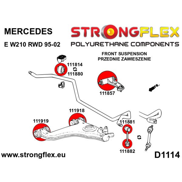 - Verify the diameter of the anti-roll bar and the type of bush in your vehicle prior to ordering. The E-W210 model is equipped with two types of front anti-roll bar bushes, either 111814 or 111880. Refer to image S1100 for clarification.