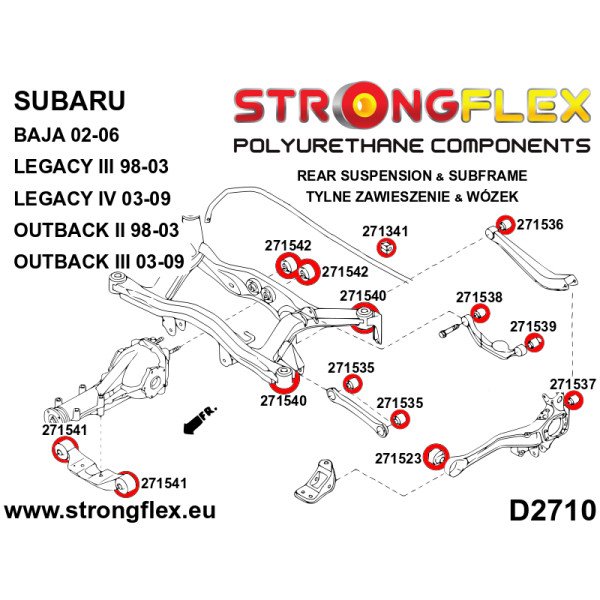 Compatible with a range of Subaru models, including the Baja (2002-2006), Legacy III / Outback II (1998-2003), and Legacy IV / Outback III (2003-2009), this bush kit is a versatile solution for those looking to improve their vehicle's suspension performance. Each kit includes four high-quality bushings (part number 4x271540A), ensuring that you have everything needed for a complete installation.