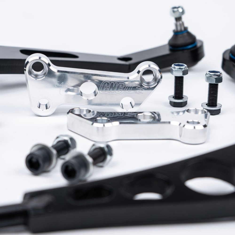 Adapters are milled on CNC machines, which gives a high quality finish and 100% matching of the adapter to the steering knuckle and pin ends. For E36, the adapters are made of the hardest aluminum acc. To Polish standards. The control arm is cut with a laser and has precisely machined holes for pins and stabilizer mounting (we recommend its assembly for better driving of the car in skidding, especially when the suspension is not "concreted").