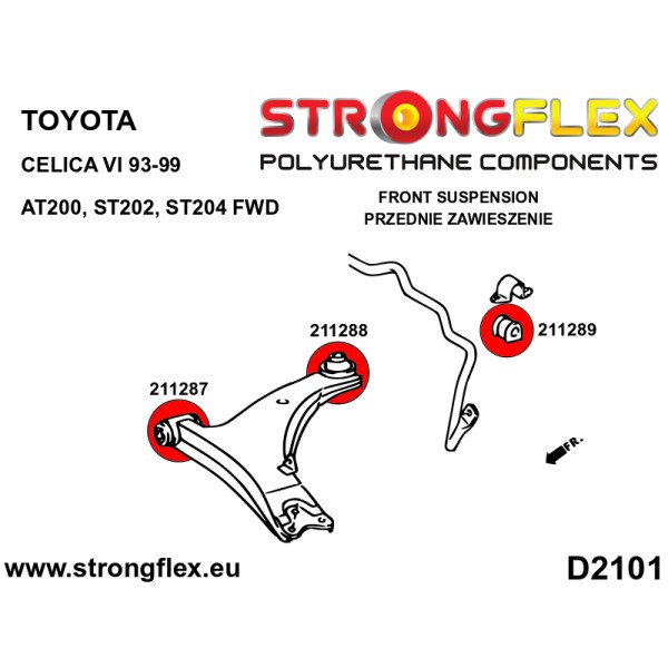 Elevate your Toyota Celica VI's handling and performance with our Complete Suspension Bush Kit. Designed specifically for the 1993-1999 models, this kit is engineered to enhance your vehicle's responsiveness and stability on the road. Each component is crafted from high-quality polyurethane, providing superior durability and resistance to wear compared to standard rubber bushings.
