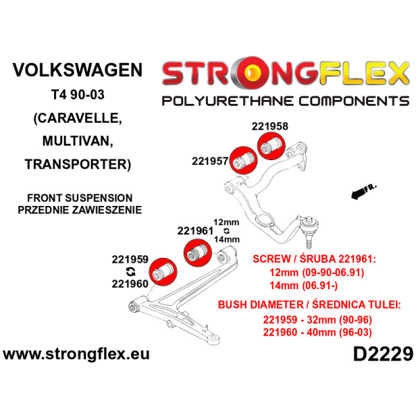 For vehicles produced from 09/1990 to 06/1991, a 12mm screw is utilized. For those manufactured post 06/1991, a 14mm screw is required. - "Wishbone Bush Type" refers to bushings 221959/221960: